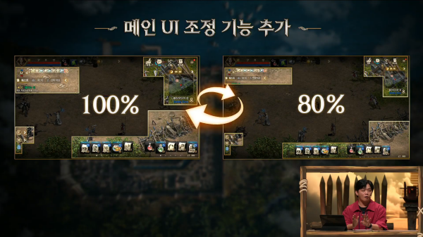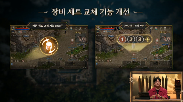 장비 세트 교체 기능이 개선됐다. 기존에는 스왑 하려면 창을 열고 세트 번호를 바꿔야 하는 번거로움이 있었는데, 이제 클릭 한 번으로 빠르고 편리하게 전환 가능하다. 해당 UI는 위치 이동 및 가로세로 배치도 할 수 있다. 또한, 메인 UI 조정 기능이 추가되어 설정 패널을 통해 크기를 조절할 수 있다.
