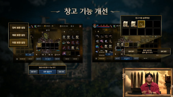 창고 기능도 개선된다. 보관하고 싶은 장비를 설정해 빠르게 보관하는 자동 보관 설정이 추가됐고, 이용 시 품목 상관없이 대량의 아이템을 찾거나 맡기는 것도 가능해진다.