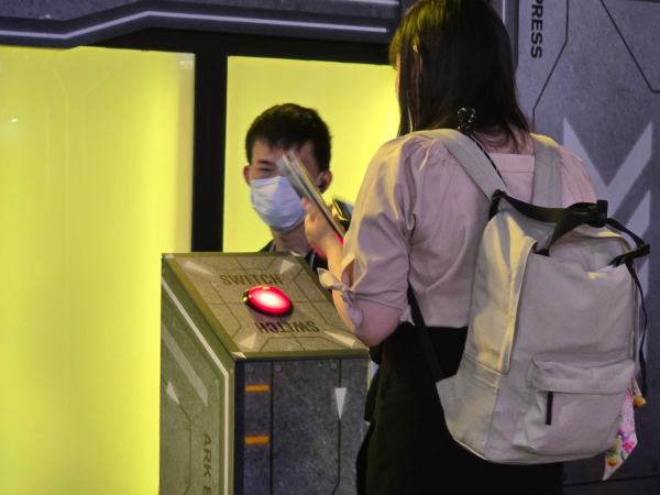 관람객이 이 버튼을 누르면 화려한 효과음이 난 후, 뿌연 창이 깨끗해지면서 게임의 주요 등장인물들이 등장한다. 게임에서 이뤄지는 대원 모집을 실제로 구현한 것이다.