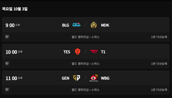 스위스 스테이지는 한국 시간으로 오는 10월 3일부터 시작된다. 첫 경기는 BLG와 MDK가, 두 번째 경기는 TES vs T1의 경기로 배정됐다. 이후 경기를 지속하게되며 첫 3승 0패 진출팀은 한국 시간으로 10월 6일 새벽에 나온다.