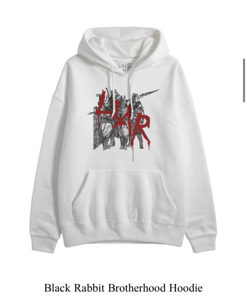 'P의 거짓' 후드티와 P의 거짓 로고가 새겨진 검정색 모자가 판매 중이다.
