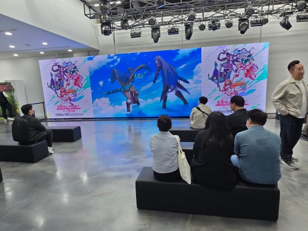 그 옆에는 대형 화면으로 '프리코네'의 세상을 엿볼 수 있는 휴게 공간이 마련됐다. 여러 개의 의자가 있는 만큼, 관람을 하다 잠시 쉬어갈 수 있는 공간으로 구성됐다.