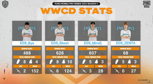 EOS가 탄탄한 스쿼드의 힘으로 다수의 팀들을 누르며 치킨에 성공했다. '2024 PMPS 시즌3' 파이널 1일차 매치4의 치킨을 가져간 EOS는 11킬 치킨을 바탕으로 최상위권에 올라설 수 있는 발판을 마련했다.