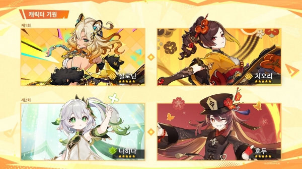 캐릭터 이벤트 기원에는 1회에 실로닌과 치오리 부티크의 사장이자 폰타인의 유명 패션 디자이너 '치오리'가 등장한다. 이어 2회는 정선궁에 사는 '나히다', 왕생당의 77대 당주로 젊은 나이에도 불구하고 리월의 장례를 주관하는 '호두'가 등장할 예정이다.