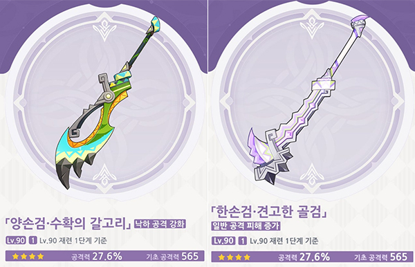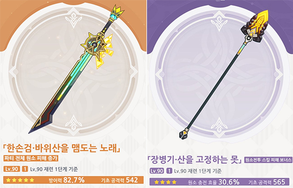 신규 무기는 3종이 추가된다. 한손검 '바위산을 맴도는 노래'는 파티 전체 원소 피해를 증가해 실로닌에게 잘 어울리는 무기다. 원소전투 스킬 피해 보너스가 부여된 장병기 '산을 고정하는 못'과 낙하 공격에 특화된 양손검 '수확의 갈고리', 일반 공격 피해가 증가하는 한손검 '견고한 골검'도 새롭게 추가된 무기다.