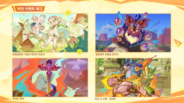 신규 이벤트는 무려 4종이나 준비됐다. ▲알록달록한 사탕과 장미의 찬송가 ▲꿀벌레의 보물을 찾아서 ▲투쟁의 향연 ▲회상 속 수행/열정편 등이다. 알록달록한 사탕과 장미의 찬송가는 수메르에서 화신 탄신 축제 준비가 한창이라는 소식을 들은 유저와 페이몬의 여행을 다루고 있다.
