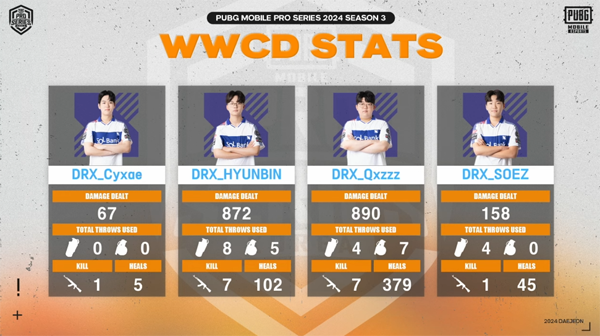 치킨 가능성이 가장 높은 농심이었으나 양각 상황에 몰리며 아쉽게 후반까지 경기를 가져가지 못했다. DRX는 다수의 인원 손실과 함께 분명 위기가 있었으나, 훌륭히 기존 팀들의 전투상황을 잘 이용해 많은 이득을 취했다.