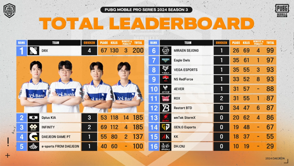 파이널 매치서 후반 뒷심을 발휘 한 DRX가 결국 1위 자리를 지키며 '2024 PMPS 시즌3' 최종 우승팀에 등극했다. 2위 디플러스 기아와 3위 인피니티가 마지막까지 추격의 기세를 높였지만, DRX의 상승세가 더 좋았다.