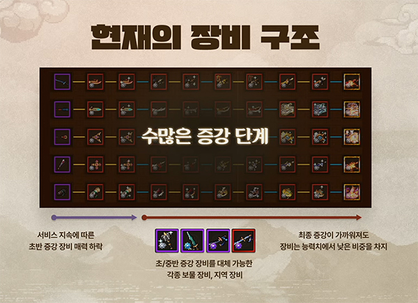 현재 ‘바람의나라: 연’ 장비 구조는 쓸만한 장비가 되려면 수많은 증강 단계를 거쳐야 했다. 하지만, 서비스가 지속되면서 초반 증강 장비의 매력이 하락하기 시작했다. 또한, 최종 증강이 가까워져도 장비는 능력치에서 낮은 비중을 차지해 결국 장비 개편을 단행하기로 했다.