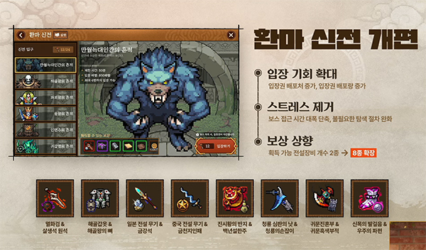 환마 신전은 보상 상향을 통해 획득 가능 전설장비 개수 2종을 8종으로 확장한다. 입장권의 배포처와 배포량도 증가하고, 보스 접근 시간도 대폭 단축한다. 불필요한 탐색 절차 도 줄여 플레이에서 오는 스트레스도 완화한다.