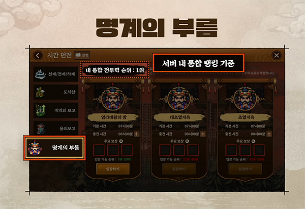 경쟁은 크게 이계의 집결지, 명계의 부름, 북방의 패자, PvP 개편으로 구성된다. ▲이계의 집결지는 많은 수행자들이 참여하도록 설계했다. 2주 간격으로 매칭과 전투가 반복된다. 신청과 매칭 방식으로 입장할 수 있는데, 해 권역 12개와 달권역 6개 구역으로 이뤄진다. 매칭은 문주가 구역을 신청해야 하며, 전투는 구역별 배정된 문파간에 펼쳐진다.
