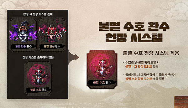 추가로 불멸 수호 환수에 천장 시스템을 적용한다. 수호/탑승 불멸 확정 도달 시 불멸 수호 확정 포인트를 획득하며, 업데이트 시 그동안 합성 기록을 계산해 불멸 수호 확정 포인트로 소급 적용된다.