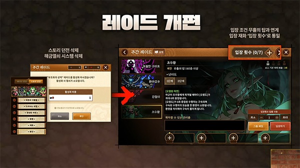 레이드 개편과 콘텐츠 UI/UX 개편도 준비 중이다. 우선, 주간 레이드를 개편해 현재의 복잡한 해금열쇠 입장방식을 삭제하고 스토리 던전 완료를 강요하는 불편도 없앤다. 스토리 던전은 이제 연대기로 이동해 스토리 클리어 여부와 상관없이 자유롭게 레이드를 플레이할 수 있다.