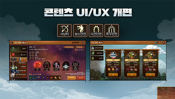 콘텐츠 UI/UX는 신규 유저들이 콘텐츠 정보를 알기 어렵다는 피드백에 따라 개편을 준비하게 됐다. 핵심은 모든 정보를 한 눈에 알 수 쉽게 변경하는 데 있다. 우선, 메뉴에 변화를 줘서 콘텐츠 메뉴는 직관적으로 변경했으며, 크게 사냥터, 보스던전, 시간던전, 특수던전으로 분류했다.