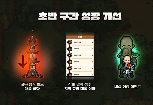 아울러, 신규 유저 유입을 위해 초반 구간 성장이 개선된다. 지옥 탑 난이도가 대폭 하향되고, 장비 결속 점수는 지역 효과를 대폭 상향했다. 업데이트와 함께 내실 성장 이벤트를 통해 초반 구간을 매끄럽게 진행하고 누구나 쉽게 적응할 수 있도록 도울 예정이다.