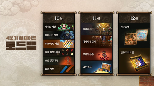 10월에는 ▲레이드 개편 ▲환마신전 개편 ▲PvP경험 개선 ▲직업 밸런스 패치 ▲초반 성장 개편 ▲상점 개선이 진행된다. 이어 11월에는 ▲북방의 패자 ▲이계의 집결지 ▲명계의 부름 ▲넥슨 링크가 추가된다. 마지막으로 12월에는 ▲신규 지역과 ▲신규 지역의 탑이 도입된다. 하반기 업데이트는 오는 10월 24일부터 순차적으로 업데이트 될 예정이다.