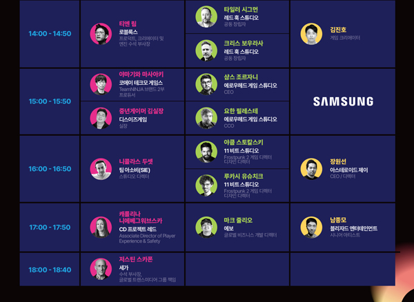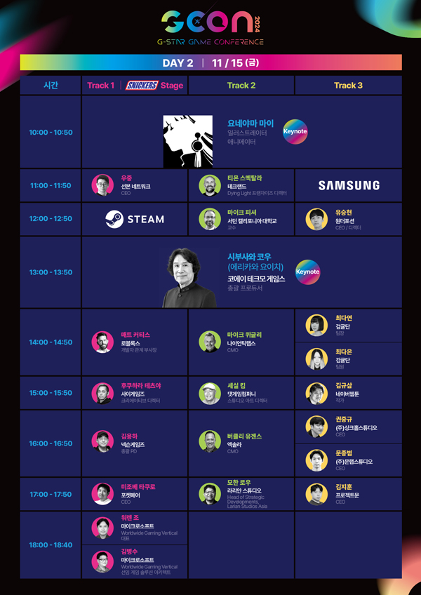 또한, 유튜버 ‘중년게이머 김실장’ 채널도 연사로 이름을 올렸다. SIE에서 '블러드본', 테크모 게임스에서 '와룡: 폴른다이너스티' 등을 담당했던 야마기와 마사아키 프로듀서와 함께 연단에 올라 글로벌 인기를 얻고 있는 소울라이크 장르의 현재와 미래에 대해 이야기를 나눈다.