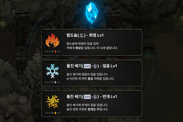 지원하는 원소는 불, 얼음, 번개, 바람 등 4가지 원소다. 원소의 일반 공격이나 주언과 같이 어디에 붙느냐에 따라 성능이 조금씩 다르게 구성한 점도 돋보인다. 반면, 원소의 숫자가 그렇게 많지 않기에 향후 게임을 유리하게 풀어갈 수 있는 빌드가 고정될 수도 있어 다양화 측면에서 약간 아쉬움이 남는다. 또한, 원소에 따른 비주얼적인 효과가 육안으로 쉽게 눈에 들어오지 않는 부분도 일부 존재한다.
