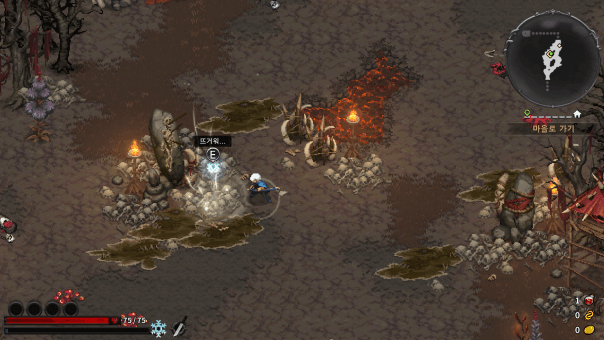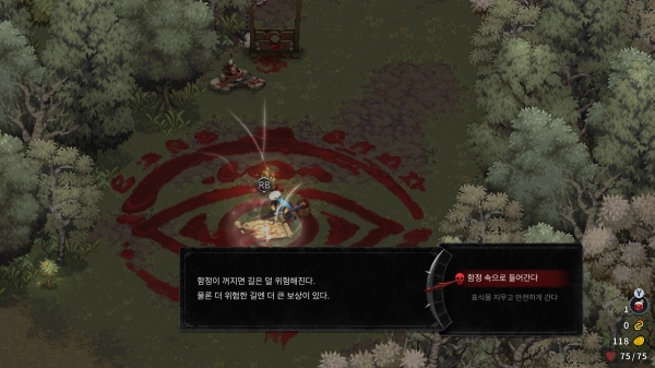 즉, 해골 마크는 현재 난이도를 기준으로 하드, 일반 경로는 노말이나 이지 경로로 이해하면 된다. 체력에 여유가 있고, 회복 포션도 충분하다면 어려운 길에 도전할 만한 용기가 생긴다. 반면 딸피에 포션도 없다. 그러면, 뒤돌아볼 것 없이 기본 경로로 진행하도록 배려했다. 즉, 선택에 따라 스스로 맵을 개방해 나가는 방식으로서, 책임도 오롯이 자신의 몫이다.