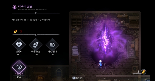 업그레이드 요소는 다양하다. 저주의 균열에서는 최대 체력, 사망 1회 무효, 각성 유지시간, 차지 공격 등을 올릴 수 있다. 유물 수납장은 시작에 앞서 장착할 유물을 선택하는 장소다. 최대 체력을 추가하거나 시작과 함께 원소의 정수를 사용하기, 추가 포션을 갖고 시작하는 등 전장에 돌입할 때에 보다 원활한 플레이를 도와주는 요소다.