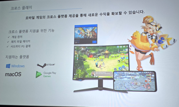 크로스 플레이도 주요 기능 중 하나다. 하이브 플랫폼을 통해 모바일 게임을 PC 게임으로 빌드할 수 있고, 런처와 패쳐, 제3자 결제를 지원하며 스팀과 구글플레이게임즈도 지원한다. 관건은 이를 통해 매출을 늘릴 수 있는 부분이다. 실제로 모바일 게임을 PC로 출시하는 경우 신규 매출을 창출하고, 심지어 모바일보다 더 높은 결제를 보이는 경우도 있었다고 한다.