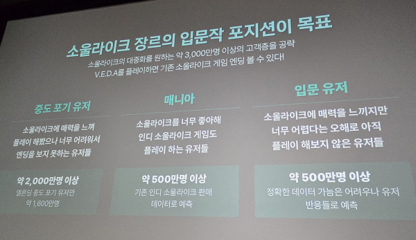 이렇게 되기까지 정 대표는 3가지의 요소를 꼽았다. 첫째는 ‘찾아오게 만든다’다. 창업 후 3~4개월 동안 프로토타입으로 뱀서라이크 게임을 만들었는데, 20년 넘는 경력자의 결과물로는 평이 좋지 않았다. 이에 방향을 전환해 소울라이크 게임 ‘베다’의 개발을 시작했다.