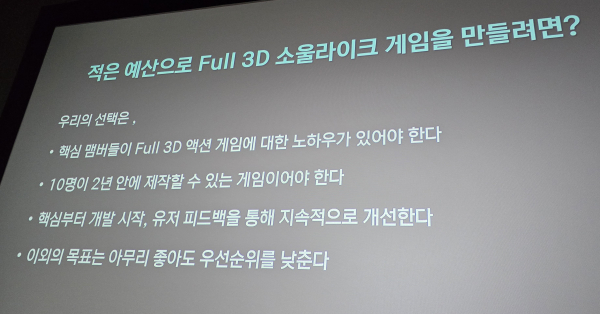 두 번째는 '가능한 목표를 수립한다'다. 멤버들이 경력이 많은 만큼 개발에 대한 욕심이 있기 마련이다. 그래서 '베다'는 처음에 오픈월드 소울라이크를 생각했다고 한다. 하지만 만들 줄은 알지만 만들 수 없다는 결정을 내렸고, 자신들의 장점을 객관적으로 되돌아봤다.