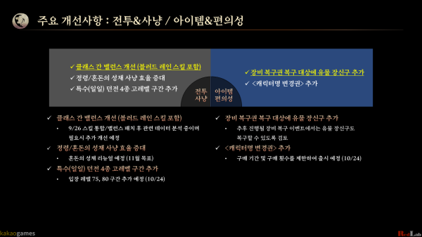 그 밖에도 10월에는 길드 연구소 확장과 많은 유저들이 요청했던 캐릭터명 변경권이 출시된다. 잦은 변경은 게임 운영상 문제를 야기하거나 비매너 플레이 문제가 발생할 수 있어 계정당 1회로 한정된다.