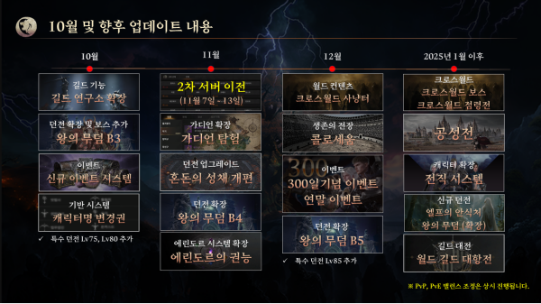 11월에는 ▲2차 서버 이전과 가디언 기능 확장을 위한 ▲가디언 탐험, 던전의 효율과 재미를 업그레이드한 ▲혼동의 성채 개편이 기다린다. 또한, ▲왕의 무덤 B4와 ▲에린도르의 최종 스펙인 권능이 오픈한다.