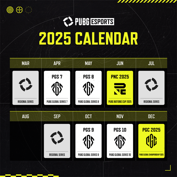 '배틀그라운드' e스포츠 2025시즌은 3월 지역 리그를 시작으로 본격 가동된다. 이후 PGS 7과 8이 진행되며, 각국 대표들의 경쟁 대회인 펍지 네이션스 컵(PNC)이 6월 열린다. 이후 두 번의 지역 리그 이후 PGS 9와 10을 진행한 다음 PGC 2025로 향한다.