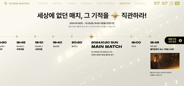 20일에는 FC 스피어와 쉴드 유나이티드의 본격적인 아이콘 매치 경기가 열린다. 오후 6시 킥오프를 시작으로 하프 타임 시간에는 올타임로우의 축하 공연이 펼쳐진다. 이후 후반전 경기와 함께 마지막 시상식을 끝으로 모든 '아이콘 매치' 행사는 종료된다.