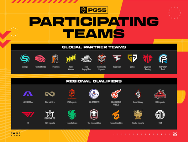 PGS는 전 세계 24개 정상급 프로팀이 최강팀의 영예를 두고 경쟁하는 국제 대회다. PGS 5는 이달 21일부터 27일까지 태국 방콕에 위치한 TVT 그린 파크 스튜디오에서 진행되며, 그룹 스테이지와 파이널 스테이지로 펼쳐진다.