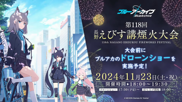 오는 11월 23일에 개최되는 나가노 에비스코 불꽃축제에서 ‘블루 아카이브’의 드론쇼가 진행되며, 출시 4주년을 맞아 개최도는 대규모 행사인 ‘블루아카 페스! 포에버 챌린지’가 내년 1월 17일부터 3일간 개최된다.