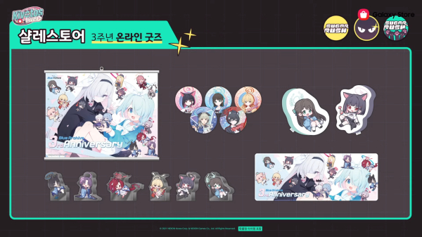 또한 ‘블루 아카이브’의 4번째 OST 음반을 선보이며, 예스24를 통해 다양한 굿즈가 판매될 예정이다. 샬레스토어에서는 3주년 온라인 굿즈가 판매되며, 토라마루 전차 완구 세트와 태엽인형으로 만들어진 스위퍼도 판매될 예정이다.