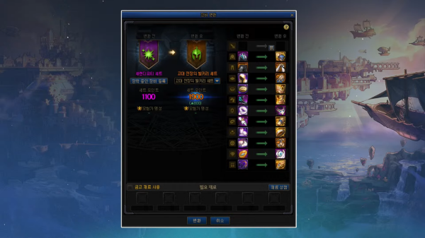 무기고와 변환 시스템에서는 세팅을 변경할 수 있다. 중천에서 획득한 장비를 해체하면 장비 정보가 무기고에 등록된다. 등록한 장비는 언제든지 변환해 사용할 수 있으며, 자유롭게 세트를 변경하는 시스템도 준비 중이다.