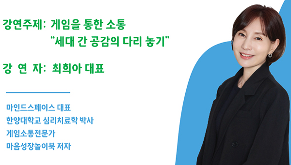 넷마블문화재단은 올해부터 기존 교육에서 나아가 보다 많은 정보를 제공하고자 게임소통포럼을 새롭게 개최하여 자녀 교육 및 게임 문화와 관련된 전문가들의 강연을 진행했다. 올해 마지막으로 열리는 이번 포럼은 오는 11월 9일 넷마블 지타워에서 진행되며, 마인드스페이스 최희아 대표가 ‘게임을 통한 소통 “세대 간 공감의 다리 놓기”’를 주제로 강연에 나선다.
