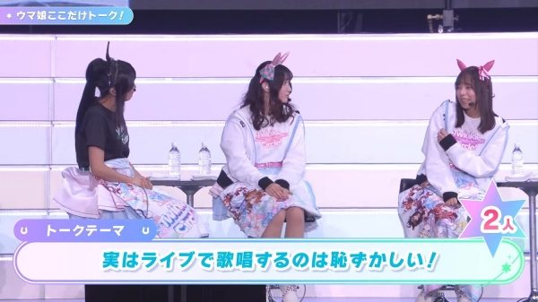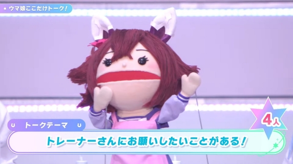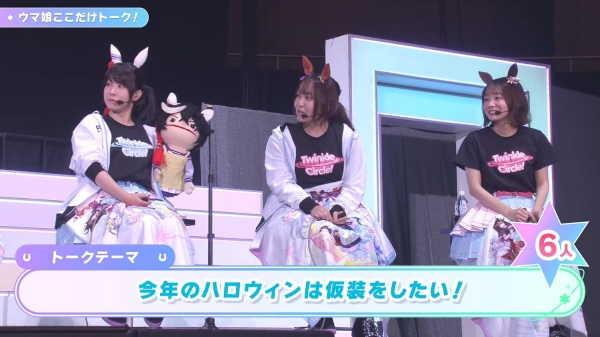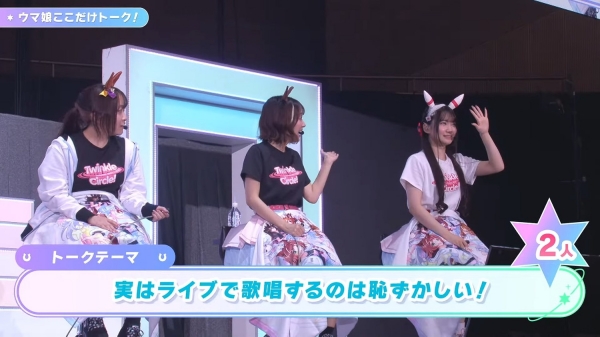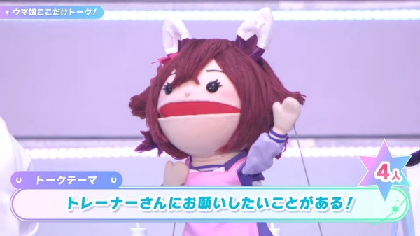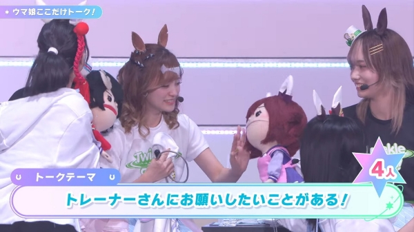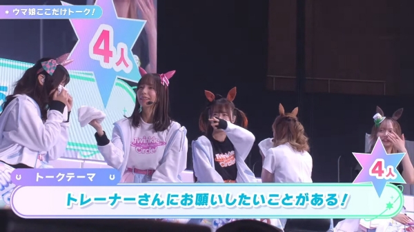“트레이너에게 부탁하고 싶은 것이 있다!”라는 주제에서는 단츠 플레임 역의 후쿠시마 하루나가 극장판 '우마무스메 프리티 더비 새로운 시대의 문'에 대해 언급했다. 이어 앞으로도 '우마무스메'의 콘텐츠는 계속 늘어날 것이지만, 그래도 본 작품을 기억해 달라고 말했다.