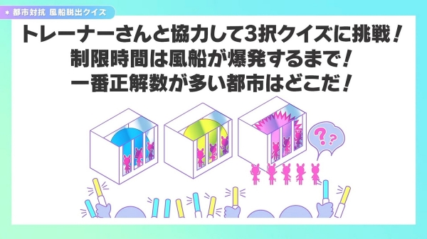 버라이어티 파트의 마지막은 퀴즈 기획 '트레이너와 협력! 도시 대항 풍선 탈출 퀴즈'가 개최됐다. 이번 기획은 '트윙클 서클!'이 개최되는 5개 도시에서 각각 경쟁하는 도시 대항전 형식의 3지선다형 퀴즈 배틀이다.