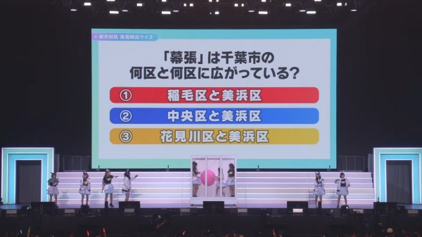 마쿠하리 공연에서 퀴즈에 도전한 것은 호시타니 미오, 아마미 유리나, 노구치 루리코, 오쿠노 카야, 후지와라 나츠미 등 5명이다. 현장의 트레이너는 펜라이트를 이용해 적색, 청색, 황색 중 어떤 선택지가 정답인지 무대 위의 해답자들에게 알려준다.