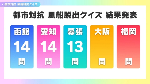 그러나 치바현 관련 문제에서 점수가 떨어진 것이 영향을 미쳐 기록은 13문제로 마무리됐다. 하코다테와 아이치 지역은 14문제를 맞춰 이에 조금 못 미치는 아쉬운 결과였다.