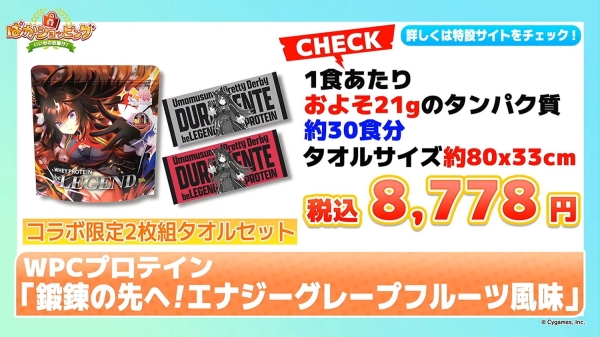 이번 영상에서는 비레전드 공식 온라인 스토어에서 판매되고 있는 컬래버레이션 단백질 '우마무스메 프리티더비 트레이닝 그 너머로! 에너지 자몽맛'과 컬래버레이션 한정 2매 타월 세트를 홈쇼핑 형식으로 재미있게 소개했다.