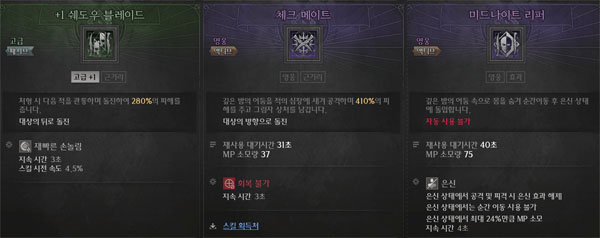 스킬 군을 살펴보면 고급 단계 스킬부터 빠른 이동기와 처형, 대미지 중심으로 꾸며져 있는 것이 특징이다. 가장 기본 스킬인 패시프 쉐도우 블레이드는 처형 효과 발동시 다음 적을 관통하여 공격할 수 있는 스킬로 연계되면서 빠른 사냥과 이동을 겸비할 수 있다.