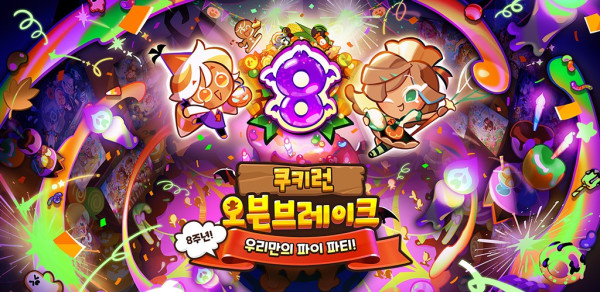 - 데브시스터즈(대표 조길현)의 개발 스튜디오 오븐게임즈(대표 배형욱)에서 개발한 모바일 러닝게임 쿠키런: 오븐브레이크가 8주년을 기념해 ‘8주년! 우리만의 파이 파티!’ 업데이트를 실시했다. 이번 업데이트에서는 호박 보름달이 뜨는 밤에만 구울 수 있다는 파이 레시피를 발견한 캔디콘맛 쿠키가 제빵사 키친싱크파이맛 쿠키와 함께 파이를 구워 호박 보름달 파티를 준비하는 스토리가 펼쳐진다. 캔디콘맛 쿠키는 파이에 들어가는 온갖 특이한 재료를 찾기 위해 난생 처음 마을을 벗어나 홀로 도시로 떠나게 된다. 궁극의 파이를 만들기 위한 두 쿠키의 여정은 타이틀 이벤트 모드 ‘최고의 파티 음식 서바이벌’에서 확인할 수 있다.