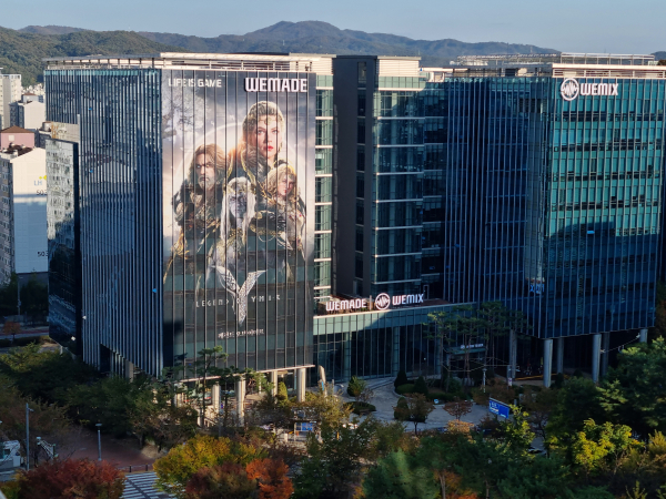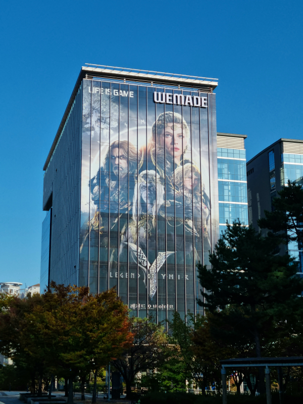 위메이드가 신작 MMROPG '레전드 오브 이미르' 출시에 앞서 사옥 대형 래핑을 진행했다.