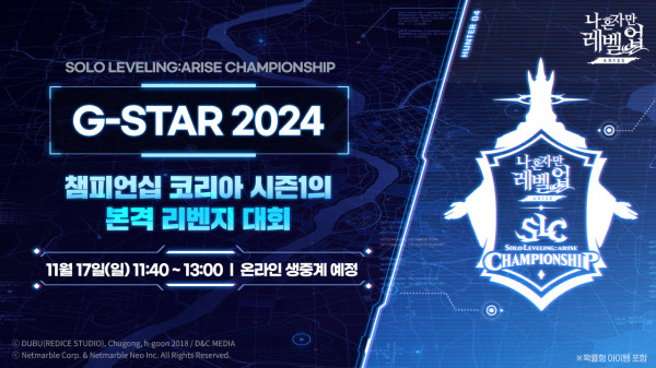 넷마블(대표 권영식, 김병규)은 오는 11월 17일 부산 벡스코에서 ‘나 혼자만 레벨업:어라이즈 챔피언십 G-STAR 2024’를 개최한다고 밝혔다.