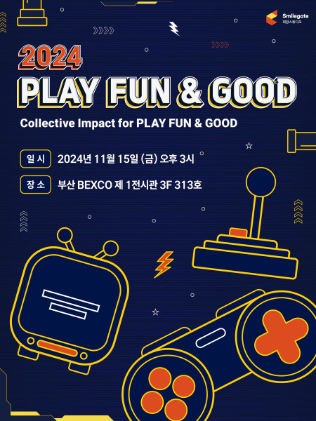 스마일게이트 희망스튜디오(이사장 권혁빈)는 ‘2024 플레이 펀앤굿 포럼’(2024 PLAY FUN&GOOD Forum)을 11월 15일 오후 3시 부산 벡스코 1관 303호에서 개최한다고 밝혔다.