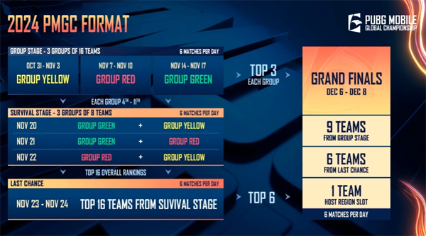 '2024 PMGC' 무대에는 총 48개 팀들이 참석했다. 이들은 16개 팀 3개 그룹으로 나뉘어 각자 4일간 그룹 스테이지 경기를 펼친다. 가장 먼저 개막전에 나선 옐로우 그룹의 16개 팀은 10월 31일부터 11월 3일까지 경기를 펼친다.