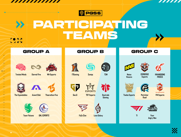 PGS는 전 세계 24개 정상급 프로팀이 최강팀의 영예를 두고 경쟁하는 국제 대회다. 이번 PGS 6는 11월 4일부터 10일까지 태국 방콕에 위치한 TVT 그린 파크 스튜디오에서 그룹 스테이지와 파이널 스테이지로 펼쳐진다.