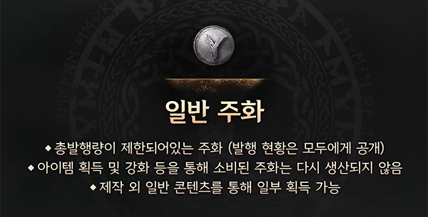 일반 주화는 총발행량이 제한되어 있으며, 발행 현황은 모두에게 공개된다. 아이템 획득 및 강화 등에 사용된 일반 주화는 다시 생산할 수 없으며, 시즌 주화처럼 제작 외에 일반 콘텐츠를 통해 일부 획득 가능하다.