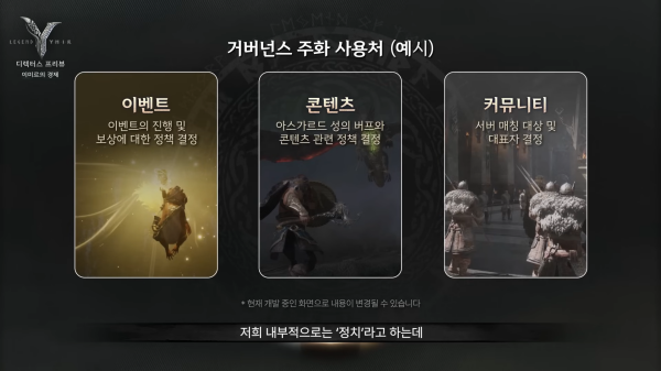 개발을 맡은 위메이드XR의 석훈 PD는 "주화 시스템은 다양한 유저가 모든 단계에 걸쳐 관여됐다"며, 일반과 시즌, 거너번스 주화의 다양성을 언급했다. 이어 '이미르'의 경제는 다양한 성향을 가진 유저 모두가 공생하고, 가치를 유지하는 방식인 '공생을 통한 가치보존'임을 강조했다.